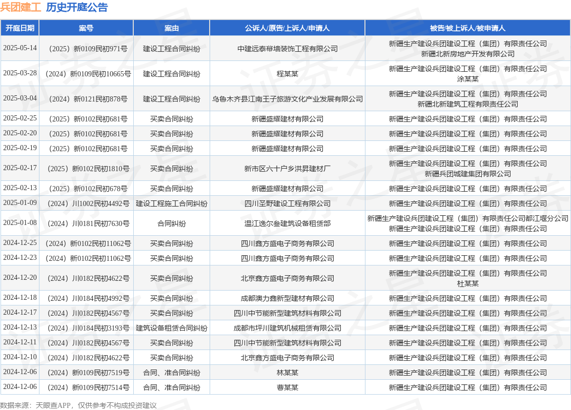 本站消息,根据天眼查APP显示,近日公布了一则新疆生产建设兵团建设工程(集团)有限责任公司作为被告/被上诉人的开庭公告,详细内容如下: